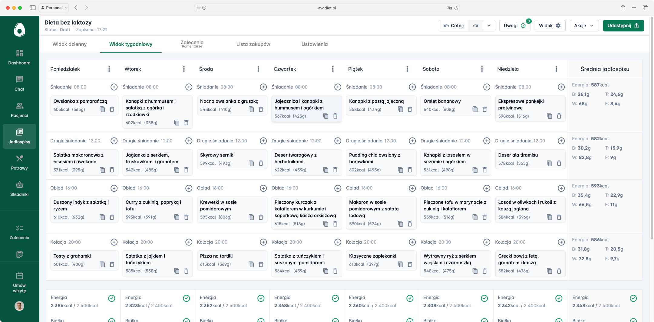 AvoDiet to profesjonalne narzędzie dla dietetyków, które pozwoli Ci działać błyskawicznie. Układaj jadłospisy, zarządzaj pacjentami i rozwijaj swoją praktykę żywieniową – wszystko w jednym, przejrzystym systemie.